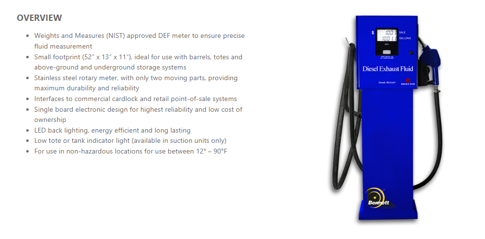The Bennett 100 and 200 Blue Fueler Models are a class of Weights and Measures (NIST) approved DEF dispensers designed for use in commercial and retail locations where demanding users require durability, ruggedness and affordability.